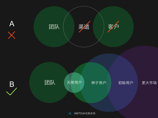 但這么做并沒有發(fā)揮出天使用戶幫助企業(yè)搭建自有用戶渠道的效果。用下面這個(gè)圖表示會(huì)更清晰一些。那位電商的朋友選擇的方法A,而我們很清楚地看到天使用戶在B中擔(dān)任的團(tuán)隊(duì)與市場之間“橋梁”與“杠桿”的角色。