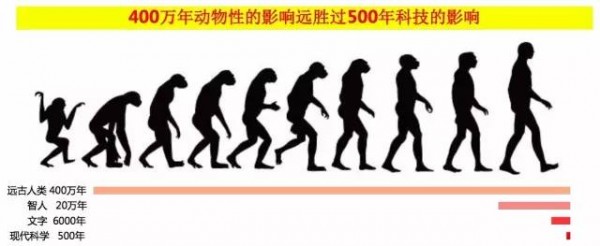 我們所有的行為都是從大腦里來的,而你的大腦是在幾百萬年的歷史當(dāng)中進(jìn)化過來的。從古人類到今天,我們有400多萬年的歷史了,現(xiàn)代智人有20萬年的歷史,文字有6000年的歷史,但是進(jìn)入現(xiàn)代社會僅僅只有500年歷史。從根本里,我們是一個(gè)感性的、情感的人,而不是理性的。400萬年的歷史讓我們變得懶惰、情感、感性化的。