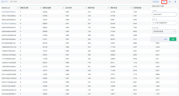 對(duì)于 7 日或者 30 日仍留下來(lái)做投資的用戶,顯然是一批忠誠(chéng)度非常高的用戶,什么樣的用戶群體有這么高的留存率?以 4 月 10 號(hào)這天的新用戶為例,一共有 1931 個(gè)新用戶,在第 7 天有 68 人留下來(lái)了,點(diǎn)擊“ 68 ”這個(gè)數(shù)字,我們進(jìn)入了用戶列表界面。