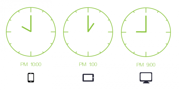 手機端分享最高峰在晚上10點 ;平板端分享最高峰在下午1點;臺式機和筆記本分享最高峰在晚上9點