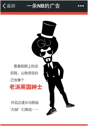 New Balance請網(wǎng)絡意見領袖:顧爺(他以一個藝術愛好者的身份,用獨具一格的形式向讀者講那些高雅的畫作,以此聞名),在他的微信公眾號”顧爺”上發(fā)布:”一條NB的廣告”,講述了他對鞋的懷舊之旅。最后顧爺求大家測試”型格”:發(fā)現(xiàn)NB型生代。通過一組測試題,測測你是雅痞文青李大齊,還是鬼馬宅客陳吰。
