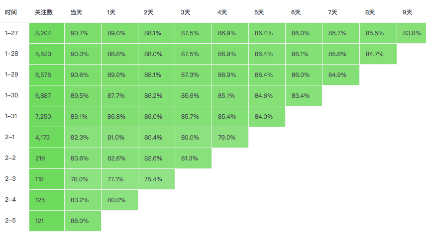 例如這是我們某個(gè)公眾號(hào)春節(jié)期間新媒體一個(gè)活動(dòng)的留存圖,看10日留存基本保持在83.8%??梢哉J(rèn)定粉絲相對(duì)比較匹配,仍需后續(xù)觀察。
