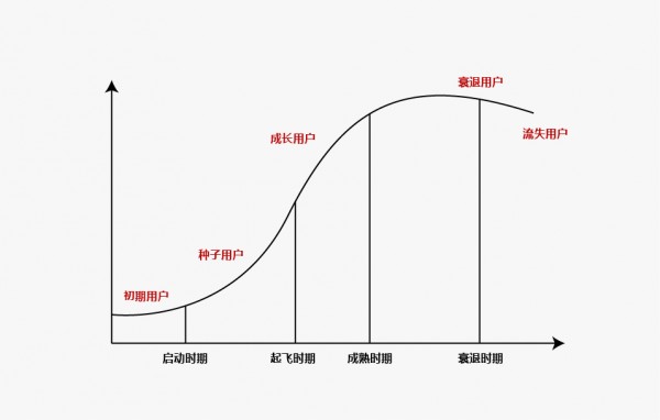 首先我們先來分析一下用戶,上圖所示是業(yè)內普遍公認的用戶成長曲線。在不同的成長階段對應著不同的用戶類型,分別是:初期用戶、種子用戶、成長用戶、衰退用戶、流失用戶。筆者在這里想重點強調一下初期用戶和種子用戶之間的區(qū)別,一般剛入道的小白通常會把兩者搞混淆甚至認為是一個概念,其實不然。