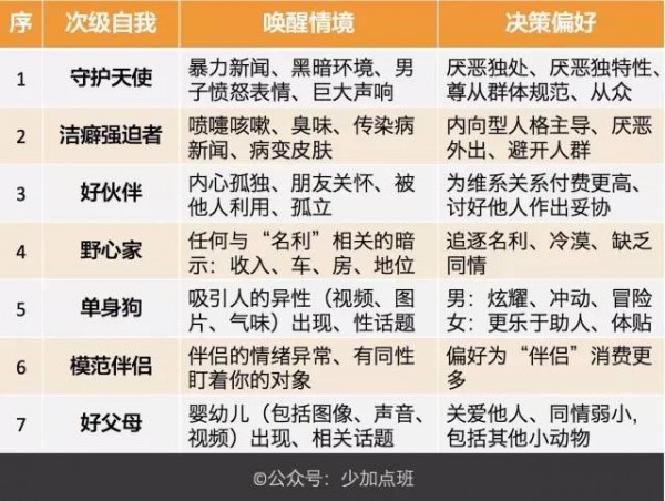 是的,若能意識(shí)到這一點(diǎn),李少加要預(yù)先恭喜下了,下面介紹7位“次級(jí)自我”時(shí),也會(huì)順帶談下每個(gè)“次級(jí)自我”對(duì)市場(chǎng)、運(yùn)營(yíng)、廣告的決策偏好。