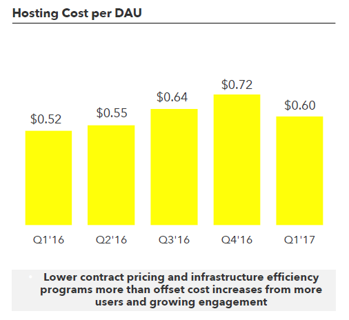 0.6美元是Snapchat最近一個(gè)季度(2017年1季度)的數(shù)據(jù),比4季度已經(jīng)有所下降,Snapchat同時(shí)購(gòu)買(mǎi)了谷歌和亞馬遜的云服務(wù),通過(guò)對(duì)兩者的談判和合理使用,一直在試圖降低用戶(hù)服務(wù)成本。