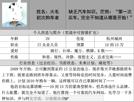 有些人喜歡用因子來說用戶,其實我個人感覺,一般產(chǎn)品除非SAAS之類,提供解決方案的?;旧蠈?yīng)的用戶都是人。所謂因子,就是指人的屬性。人的屬性:包括出生年月,性別,工作經(jīng)歷,年齡,這些都是人的屬性中的一種。這個時候,我的建議是你先把整體的用戶屬性都列出來,然后再去篩選。如下圖(截圖一和截圖二):這個是某個汽車網(wǎng)站的用戶模型,好多年前的了,我也懶得重新畫了。下面的個人信息,所處環(huán)境,個人經(jīng)歷等,你可以以一種流水賬的形式寫出來。最主要的目標(biāo)是寫誰在什么地方,做了什么,要做什么,做過什么,收入什么,家庭背景什么的。當(dāng)用這些信息把一個人完整的描述出來的時候,你再去抽象你的具體因子,具體屬性,到底哪些是你需要的屬性。
