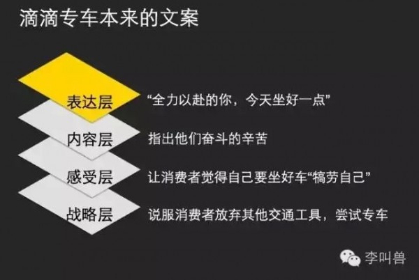 從上面的分析看出,各家專車的文案戰(zhàn)略基本一樣:說服消費者放棄其他交通工具,嘗試專車。