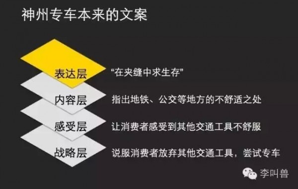 很多自嗨式的X型文案就是這樣:他們只關注最上層的表達層,卻根本不知道自己要表達的內容到底是什么,也不清楚自己要影響用戶的什么感受,更加不知道這樣的文案戰(zhàn)略價值何在。