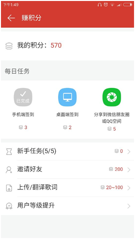 網(wǎng)易云音樂獲得積分的方式有每日任務(wù)、新手任務(wù)、邀請好友、上傳/翻譯歌詞、用戶等級提升5種,都強調(diào)讓用戶多使用APP(聽歌、參與互動、貢獻UGC內(nèi)容等)。