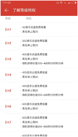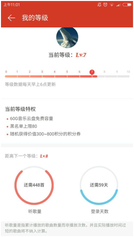 網(wǎng)易云音樂的用戶等級由聽歌量、登錄天數(shù)決定,一共10個等級。特權(quán)是音樂云盤數(shù)量、黑名單上限、隨機積分券,不同等級特權(quán)范圍不同。