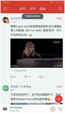 動態(tài)就類似一個小型的音樂微博,可以看到關(guān)注的人和一些粉絲較多的人發(fā)的動態(tài)。類似微博,可以點贊、評論、分享,屬于社交屬性的應(yīng)用。
