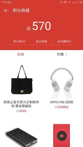 網(wǎng)易云音樂積分商城只能用積分購買商品,有實物、抽獎券、非實物三類商品。如果積分足夠高,可以得到價值較高的產(chǎn)品,吸引力還是比較大的,只是難度也比較大。