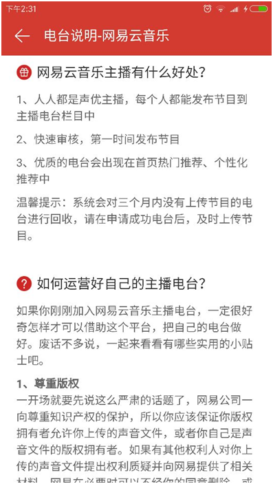 云音樂的UGC除了音樂專欄、獨立音樂人,最基本的是主播電臺。成為主播的門檻最低,每個用戶只要申請后一般都能成為主播,運營過程中需要遵循基本的規(guī)則(如申請成功后要及時上傳節(jié)目)。優(yōu)質(zhì)的節(jié)目會被推薦至首頁熱門推薦、個性化推薦中。這對有聽電臺、成為主播需求的用戶來說,是一種較好的刺激手段?;久總€音樂APP都有類似主播電臺的地方,讓用戶自我生產(chǎn)內(nèi)容。