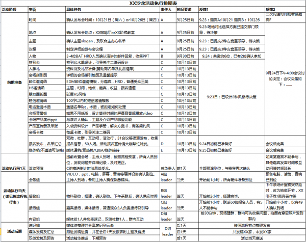 制定清晰的工作分工表,并且責(zé)任到人,不能含糊地說誰負責(zé)某一模塊就完事了,而是要把每一個工作細節(jié)都列明確定好。開場前再face to face溝通一次,是否對于工作任務(wù)清晰明了,對于突發(fā)情況的后備方案是否預(yù)備好,以免發(fā)生因為對任務(wù)理解不到位而出現(xiàn)執(zhí)行偏差的情況。