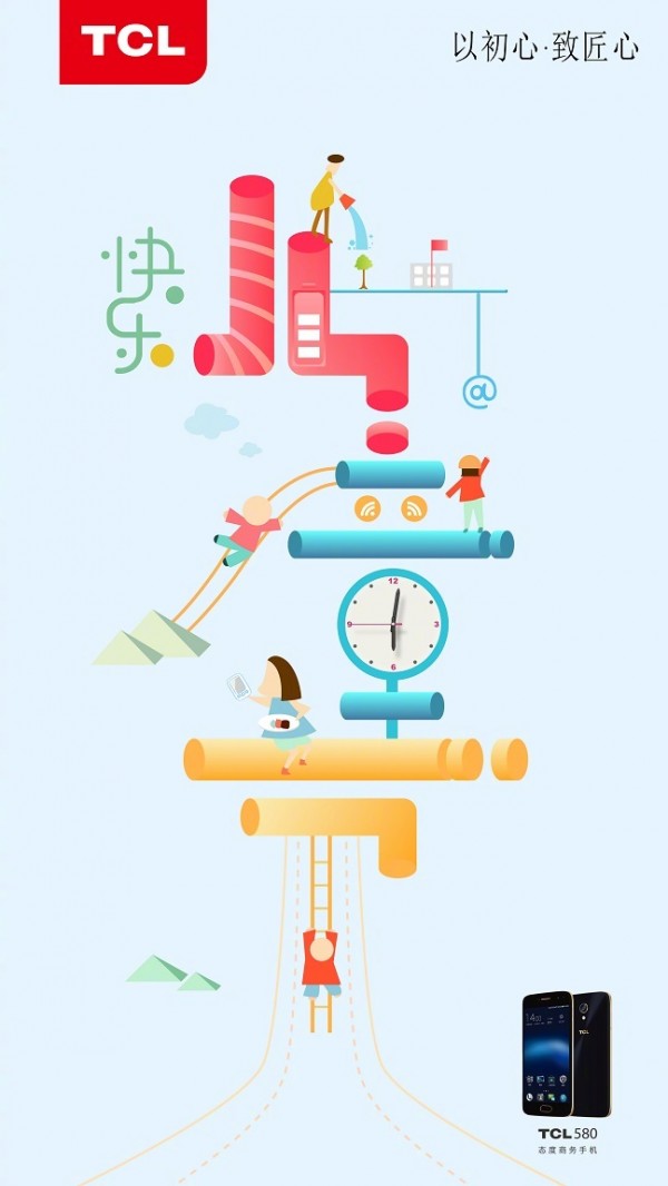 TCL的兒童節(jié)借勢(shì)海報(bào),字體設(shè)計(jì)個(gè)性十足,整體是筆畫公用式的創(chuàng)意,其中“快樂”和“兒童節(jié)”分別是兩組連體字,共用了豎筆。另外我們會(huì)發(fā)現(xiàn),這張海報(bào)除了筆畫公用的創(chuàng)意,同時(shí)兼有拼字、局部替換的字體設(shè)計(jì),三種技巧并存并沒有顯得雜亂突兀,反而讓畫面感更加豐富,童趣童味躍然紙上。
