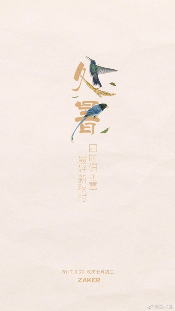 比如,移動(dòng)閱讀平臺(tái)ZAKER的處暑借勢(shì)海報(bào)中,主題字“處暑”就進(jìn)行了局部的替換處理:“處”字的一捺被一根飽滿的稻穗代替,另外一處則換成了展翅欲飛的喜鵲,以及一小片樹葉;“暑”則把中間的一撇用站立著的長(zhǎng)尾喜鵲作替換。不管是稻穗、綠葉還是喜鵲的形象,都充滿了濃濃的夏秋氣息,同時(shí)表達(dá)了豐收的喜悅,更加豐富了“處暑”的內(nèi)涵,讓文字有了生命力。