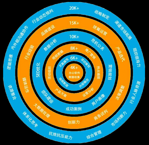 上圖將一個(gè)運(yùn)營(yíng)者從月薪4K到20K所要做的工作進(jìn)行了視覺(jué)化的表達(dá),大家可以很清晰地看到不同的薪資狀況所要承擔(dān)的責(zé)任和處理的事情是迥然不同的。