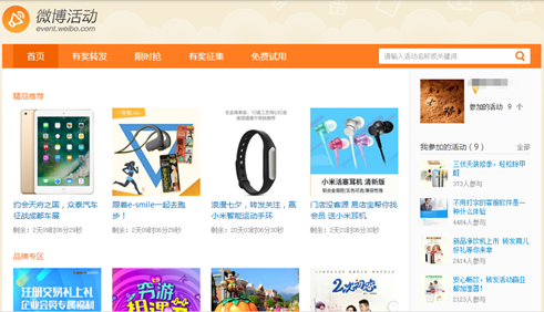 可以說(shuō),新浪微博的活動(dòng)廣場(chǎng)包含了有獎(jiǎng)轉(zhuǎn)發(fā)、限時(shí)搶、有獎(jiǎng)?wù)骷?、免費(fèi)試用等四種玩法,也就是這四種玩法,吸引了眾多企業(yè)和用戶前來(lái)參與,因?yàn)槭切吕宋⒉┒?jí)入口,所以這里的用戶流量巨大,只要我們的活動(dòng)方式和內(nèi)容能夠贏得用戶喜歡,就會(huì)吸引眾多的用戶來(lái)參與和互動(dòng)。