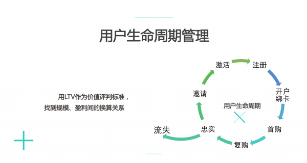 用戶運營就是以人為中心的運營,打造用戶與品牌、與商品的連接、歸屬和粘性。用戶運營貫穿整個用戶生命周期,是一項持續(xù)持久的運營工作。通過LTV模型(生命周期價值)對用戶進行不同階段的價值聚類,對其進行有針對性的運營。