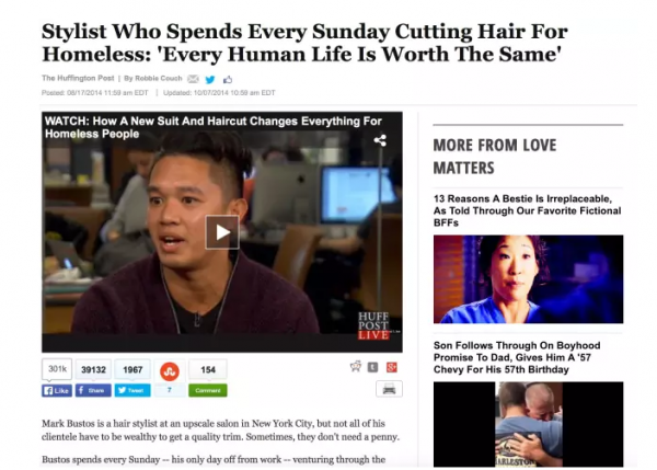 “開始吧” 首發(fā)過一篇 17 歲年輕人拯救海洋的故事,最后收獲了五百萬的閱讀數(shù)。另一篇,紐約的一個(gè)亞裔理發(fā)師給窮人理發(fā)的文章,最后有接近 450 萬閱讀數(shù)。我們做了什么呢?我們只不過是把事情的脈絡(luò)整理出來了,然后通過講故事的方式,用細(xì)節(jié)貫穿主線進(jìn)行了一下包裝。