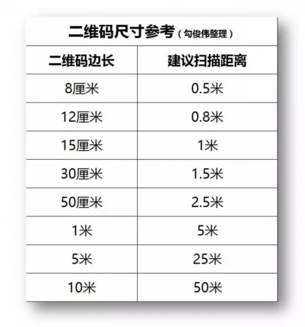 下圖是二維碼尺寸參考,在你設(shè)計線下二維碼時,可以進行反推:先看看大概的掃碼距離是多少,再計算二維碼的尺寸。