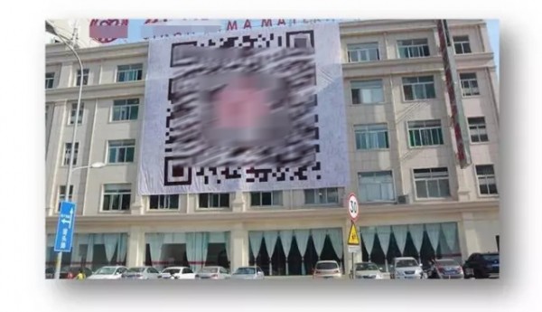 上圖是某企業(yè)的二維碼廣告,很大吧?但是路過的人卻掃不了,因為太大了。人們?nèi)绻娴姆且獟叽a,只能跑到馬路對面的樓上,這樣才能把二維碼放進掃碼框。
