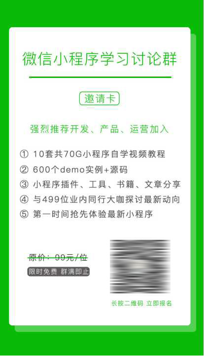 宣傳內(nèi)容:這張小卡片也是綜合了平時積累的一些邀請卡的長處,運(yùn)用了很多營銷小技巧,也是此類邀請卡常用的技巧。設(shè)計的風(fēng)格上,包括顏色、字體都是按照微信小程序的要求來的,所以整體做出來效果給人感覺很官方,可信度更高,視覺上與小程序這個熱詞關(guān)聯(lián)性增強(qiáng)。羅列賣點時按照吸引力強(qiáng)弱排序,多用數(shù)字具體化服務(wù)價值,既要深度挖掘窮舉,又要有重點的說明能夠給到用戶的價值。直接寫出產(chǎn)品所面向的用戶:開發(fā)、產(chǎn)品、運(yùn)營,使看到此宣傳的目標(biāo)用戶產(chǎn)生認(rèn)同和需求關(guān)聯(lián),提高參與活動轉(zhuǎn)化率。本來就免費的服務(wù),故意寫一個99元每位,然后劃掉,讓用戶感知到這個服務(wù)的價值在價格上的反映,現(xiàn)在免費參與進(jìn)來就占到便宜了。限時限人數(shù)加速用戶決策速度,看到就去參與,以免錯過機(jī)會。整個版面各部分的排版也是放到群里問過群友修改過,第一眼的視覺中心落在中間的5點上。