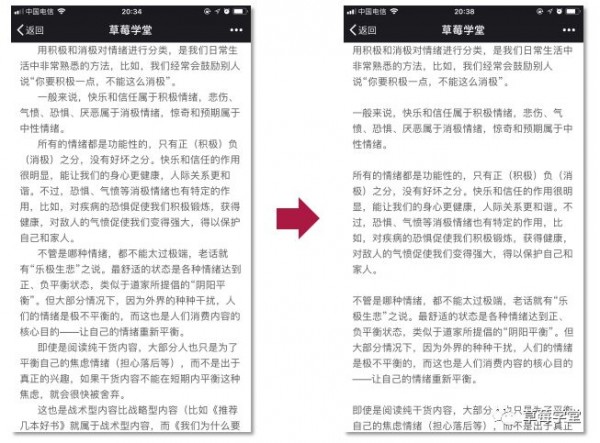 傳統(tǒng)排版一般通過首行縮進(jìn) 2 個(gè)字符的方法來區(qū)分各段,但顯然這種方式并不符合親密性原則,段間距與行間距完全一樣,并不能有效區(qū)分各段。所以,現(xiàn)在大部分新媒體編輯排版時(shí)會(huì)在段與段之間空一行,有效增加段間距,突出各部分的親密性。