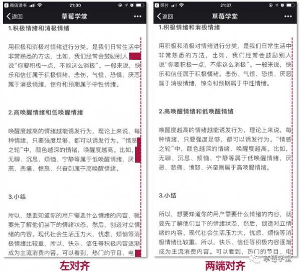 還有一個(gè)和左對齊很類似的對齊方式:兩端對齊,相比于左對齊,兩段對齊的文字邊緣更整齊,視覺效果更好,所以,在新媒體排版中一般用兩端對齊代替左對齊: