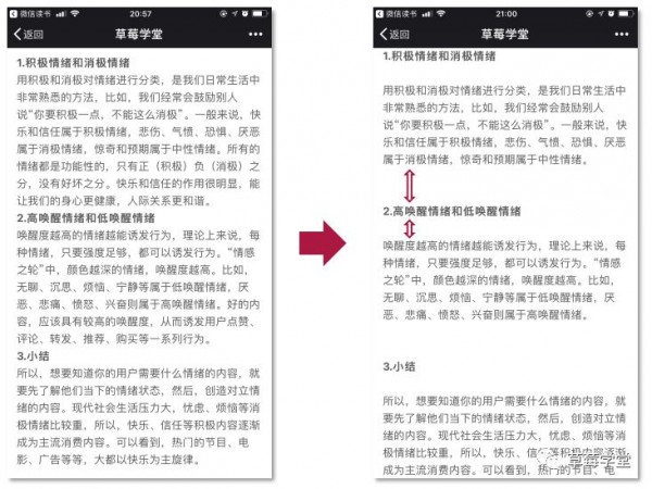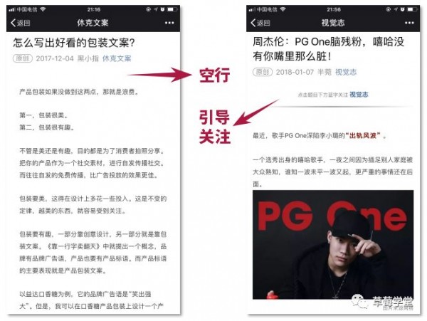 比如,你能一眼看出下面左圖中包含了幾個(gè)版塊的內(nèi)容嗎?很難,因?yàn)闆]有明顯的分區(qū)。其實(shí)左圖包含了作者簡介、留言互動(dòng)、點(diǎn)贊轉(zhuǎn)發(fā)引導(dǎo)、關(guān)鍵詞引導(dǎo) 4 類內(nèi)容(自己找找看)。