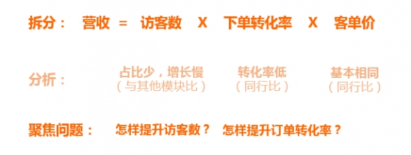 營收=訪客數(shù)*下單轉(zhuǎn)化率*客單價(為了便于理解,已將公式簡化,實際中更為復(fù)雜)