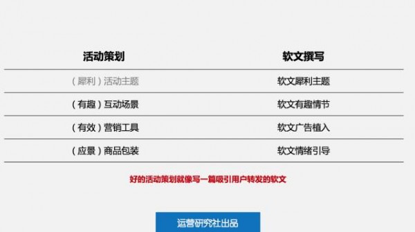 活動(dòng)的策劃是復(fù)雜版的文章寫作,“會(huì)寫文章的人做活動(dòng)都不會(huì)太差”這是我4年活動(dòng)下來(lái)一直堅(jiān)持的觀點(diǎn)。我喜歡把活動(dòng)的策劃看成文章的寫作,有效果的活動(dòng)就像一篇能夠吸引用戶轉(zhuǎn)發(fā)軟文,也就有了如下活動(dòng)與文章的類比: