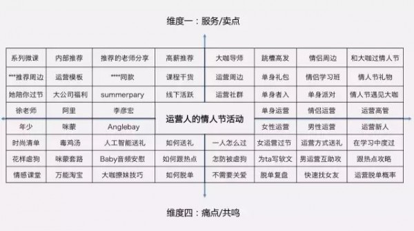 在 Y 軸負(fù)向系寫上用戶共鳴和痛點(diǎn),如何追熱點(diǎn)、如何脫單、如何過(guò)節(jié)…