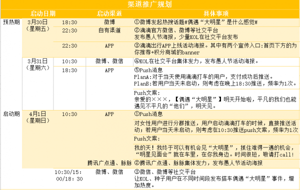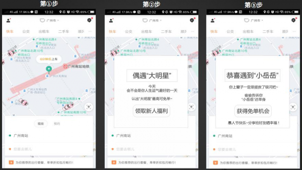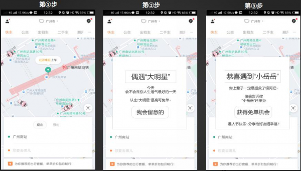 愚人節(jié)已成為各大商家借勢(shì)營(yíng)銷的節(jié)日,因其具備一定的商業(yè)價(jià)值,自帶娛樂(lè)性也備受年輕人的追捧。本次活動(dòng)設(shè)計(jì)有趣的偶遇“大明星”形式,先從好奇心和對(duì)明星的關(guān)注度高著手,加上物質(zhì)獎(jiǎng)勵(lì),提高用戶的參與度。如果有用戶遇到“大明星”以及免單的福利,滿足其炫耀的心理則可進(jìn)一步擴(kuò)大活動(dòng)的影響力。其次讓用戶在活動(dòng)中認(rèn)識(shí)滴滴打車是如此會(huì)玩的品牌印象,而不只是一款工具。