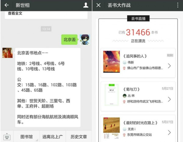 發(fā)送“北京丟”三個字到“新世相”微信后臺,就可以看到該活動在北京的“丟書”地點,同時在“丟書大作戰(zhàn)”的微信后臺看到,目前共有31466本書在漂流。在“丟書直播”一欄中,可以看到部分書籍的漂流記錄以及讀者留言,平均每天5本左右的書會被撿到。其中有的書已經(jīng)遇到了三、四位讀者,有的書被“撿”到一次后就沒有了下文。不難想到如果讀者沒有掃描二維碼,系統(tǒng)是不會有記錄的。
