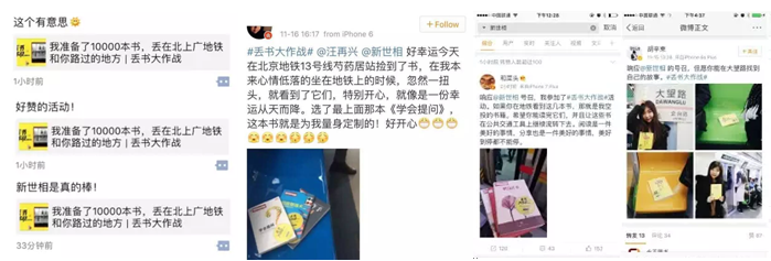 丟書大作戰(zhàn),此類的活動國內(nèi)曾經(jīng)有人發(fā)起過,但都沒有造成太大的影響。當其他人還在左右衡量評估可行性的時候,新世相真的這么做了。張偉在朋友圈宣布新世相決定做中國版的“丟書大作戰(zhàn)”一周內(nèi),就真的上線了。