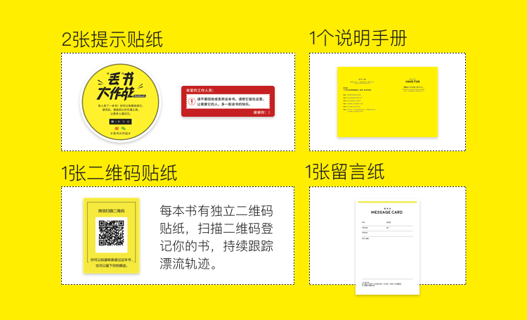 活動中的每本書都經(jīng)過特別加工:除封面上貼有“丟書大作戰(zhàn)”的醒目書貼及活動簡單說明外,扉頁還貼有每本書專屬的獨立二維碼,掃碼可了解這本書的“漂流”軌跡,每一個撿到這本書的讀者都可以看看之前的讀者留言。