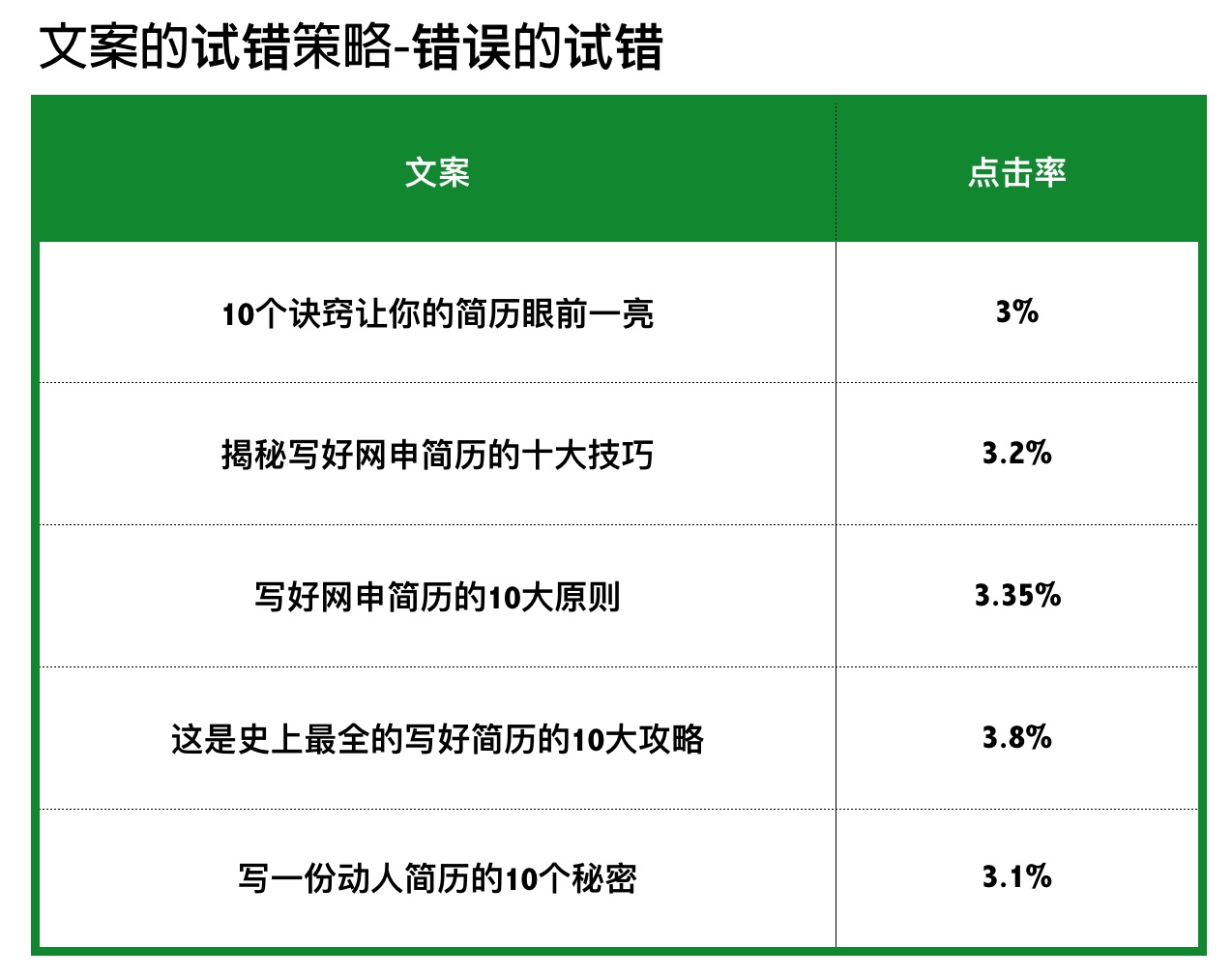 做招聘的時候,我攢了一篇關于簡歷怎么寫的文章,打算推送給求職的學生,就在百度搜了一些標題,然后大模大樣的開始試錯了,每條文案選1000uid,監(jiān)控了2個小時,結(jié)果,文案的點擊效果似乎沒有高低之別,根本試不出什么。