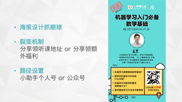 這里是指靠什么來吸引用戶,讓他/她愿意轉發(fā)海報到其朋友圈。我個人不太喜歡那種必須轉發(fā)才能獲得聽課地址的(感覺要得罪不少人了,求輕拍),一是會造成部分用戶流失;二是會略顯得不真誠。