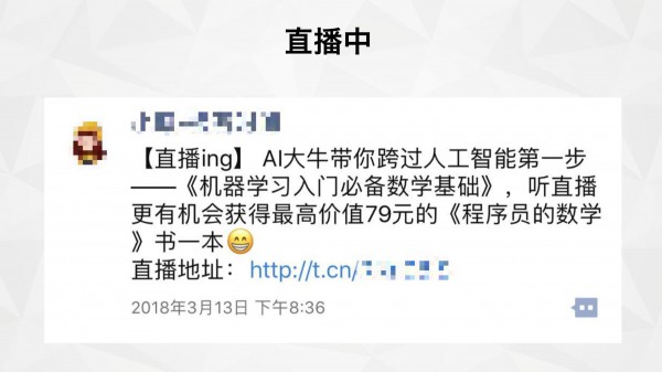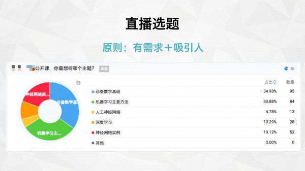 并且,結合之前做的用戶調研,發(fā)現(xiàn)這門課完課率低的原因,是因為很多用戶卡在數(shù)學基礎上。因此這個選題,既能吸引對人工智能感興趣的用戶來聽直播,又可以為老用戶答疑,可謂一舉兩得。