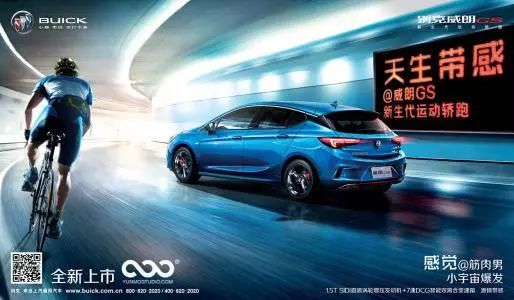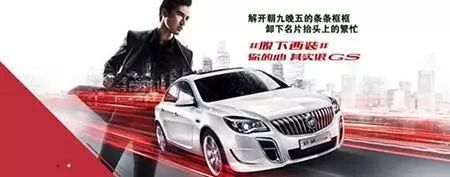 特別是君威GS,號召用戶#脫下西裝#,打造#你的第二張名片#,廣告文案:你的心,其實(shí)很GS。