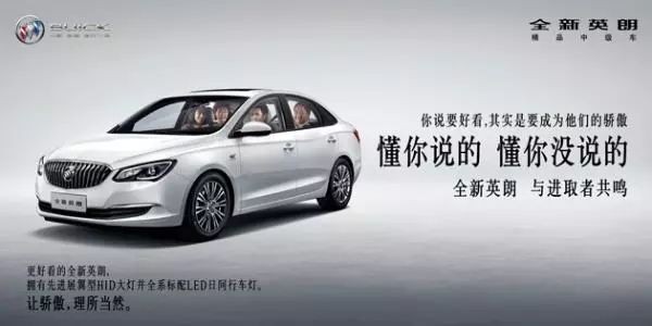 我們看別克的轎車幾個(gè)產(chǎn)品,從C級車、到B級車、再到A級車。君越定位的成功人士、君威定位的中產(chǎn)階級、英朗威朗定位的年輕白領(lǐng),從文案中可以看出三個(gè)不同人群的內(nèi)心戲是多么千差萬別。