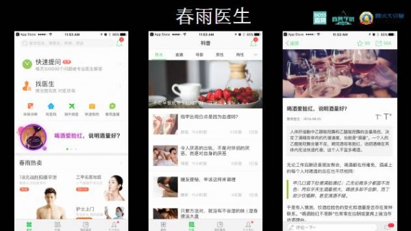 這種產(chǎn)品其實(shí)是蠻低頻的,畢竟它是用來問醫(yī)生的,沒病是不會問的。而且它也不可能做一些跟病有關(guān)的推送,這樣的產(chǎn)品本身很低頻,需要在相關(guān)價值鏈上打造一些更高頻的功能帶動這個產(chǎn)品的活躍。我們來看看春雨醫(yī)生是怎么做的。