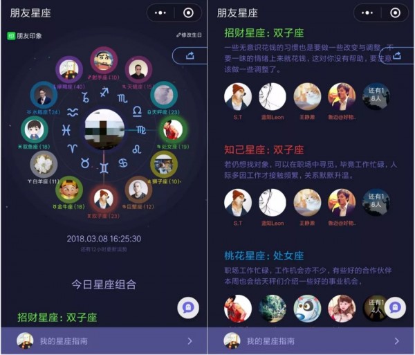 今年春節(jié),朋友印象團(tuán)隊上線了一個星座小程序“朋友星座”,第一天PV就破了千萬。小程序有一個巨大的星座羅盤,分門別類地展示微信好友的星座信息。此外,系統(tǒng)還會自動給用戶匹配今日招財星座、知己星座、桃花星座。要想微信好友出現(xiàn)在自己的星盤上,就必須轉(zhuǎn)發(fā)群聊或朋友圈,讓好友點進(jìn)小程序并授權(quán)生日信息。