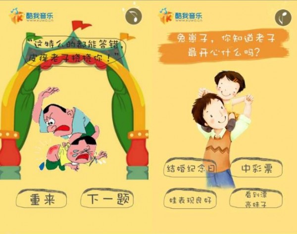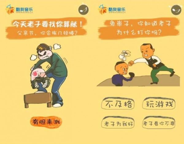 同樣測試類,選擇錯誤,會被老爸打屁股,打完屁股,可以選擇“重來”或者進入到“下一題”,打完看結(jié)果,自己被老爸揍了幾次。音效很棒,背景音樂是有趣的《兒子,我是你爸爸》,被打屁股的啪啪聲,聽著就疼,哈哈哈哈。