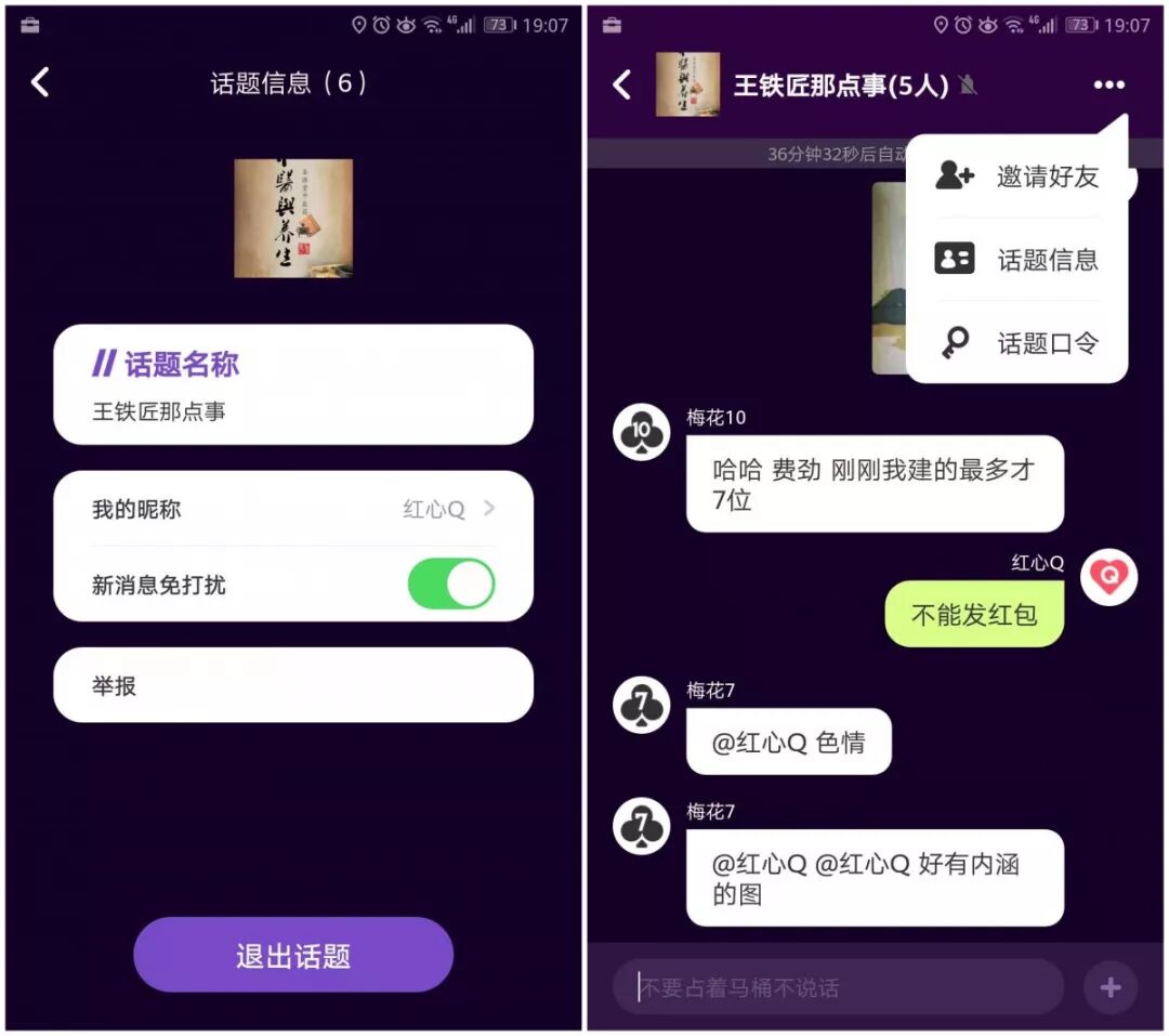 點(diǎn)擊左邊的“+”號可以直接發(fā)起悄悄話、群聊,群聊可以添加投票。在群聊界面可以復(fù)制口令發(fā)給別人參與,還可以邀請好友,在話題信息可以設(shè)置消息免打擾,以及舉報(bào)、推出等操作。