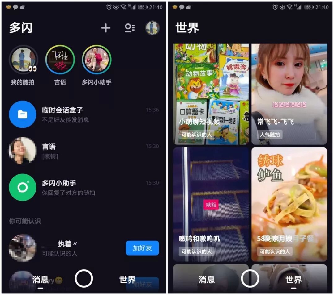 左邊是聊天,右邊是世界,多閃可以說是個(gè)輕抖音,主打社交,副打視頻,以視頻為中心,跟微信的視頻動(dòng)態(tài)而言,相當(dāng)于把微信中的視頻動(dòng)態(tài)拿出來做了一個(gè)獨(dú)立APP的感覺。