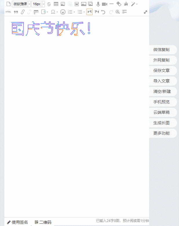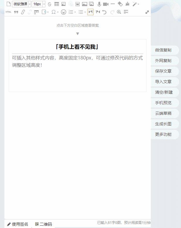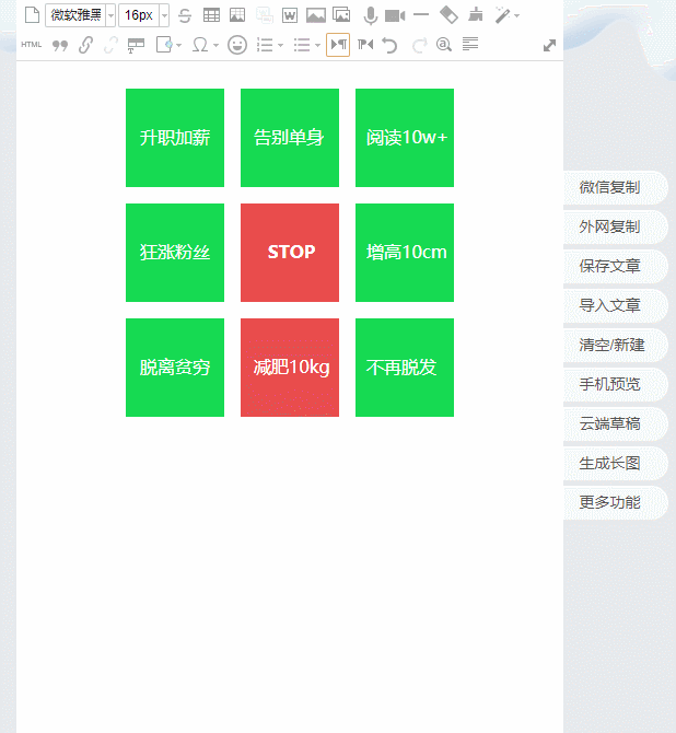 樣式教程:進入HTML模式復(fù)制所有代碼,新建文本的粘貼代碼,替換文字,復(fù)制替換后的代碼粘貼至編輯器,還可以直接點擊樣式更換配色。