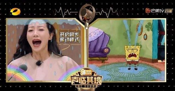 在《聲臨其境》中,韓雪一人分飾兩角,全英文配音,毫不費力的在海綿寶寶和奶奶兩個角色里聲音無縫切換,用哮喘的方式哭了整整一分多鐘,被觀眾稱“驚為天人”。