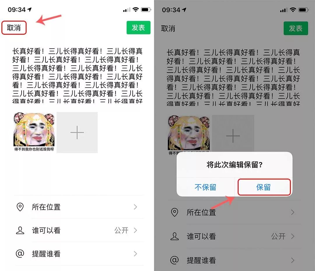 然后點(diǎn)擊左上角的“取消按鈕”,會(huì)彈出“是否將此次編輯保留?”,我們選擇“保留”,然后重新發(fā)布朋友圈,剛才編輯的內(nèi)容依舊存在,我們直接點(diǎn)擊發(fā)送即可。